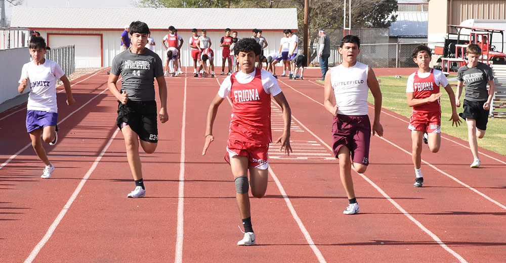 Chieftain Field was the host site for the Junior High District Track Meet this year and Friona teams felt right at home. The 7th Grade Girls & Boys team and 8th Grade Boys team all won Championship trophies and the 8th Grade Girls team won 3rd place. In the photo — Brandon Lozano (middle) wins the 7th Grade Boys 100 Meter Dash and Giovani Gonzalez finishes in 8th place.