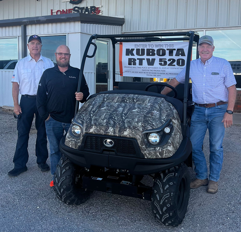 Ride Like The Wind — Mitchell Wiseman (right) is shown with the Kubota RTV that he won in the Fire Department’s Annual Fundraiser. Presenting the vehicle is Fire Chief Danny Campbell (far left) and LoneStar Ag Kubota Sales Representative Heath Keller.