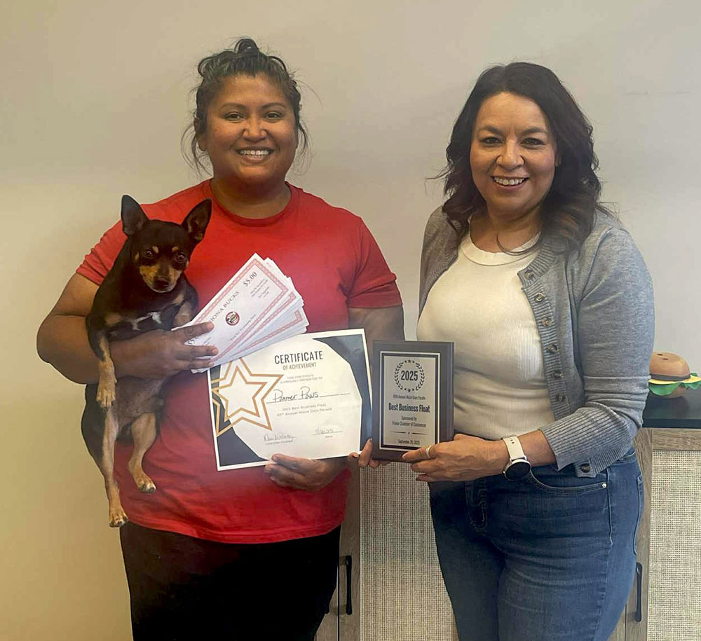 Friona Chamber of Commerce Executive Director Mari Martinez presented a certificate, plaque, and $150 in Friona Bucks to each of the two Maize Days Float Contest winners.
